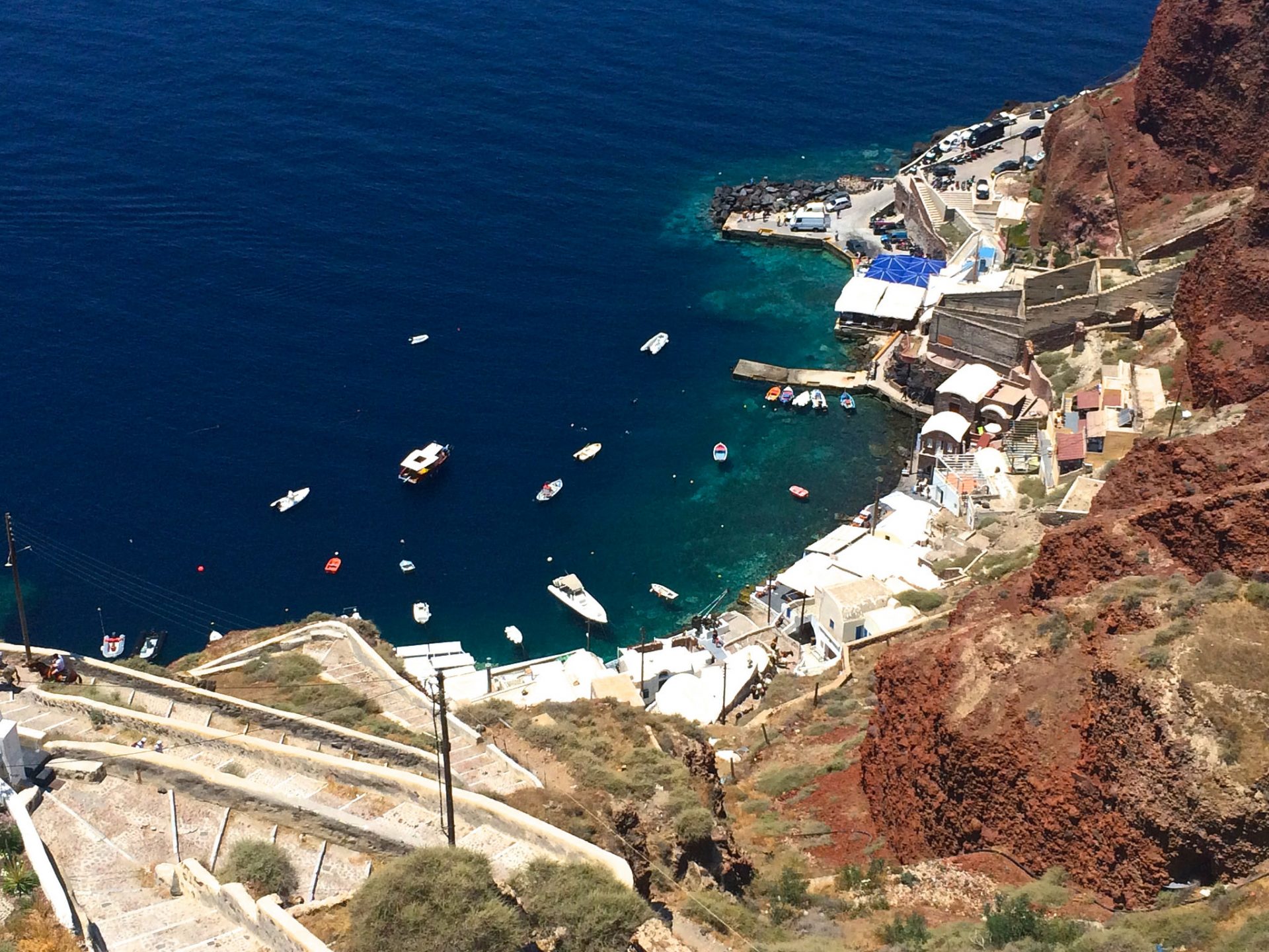 Ammoudi Bay from above, you can see the steep stairs in the left bottom corner of this photo.