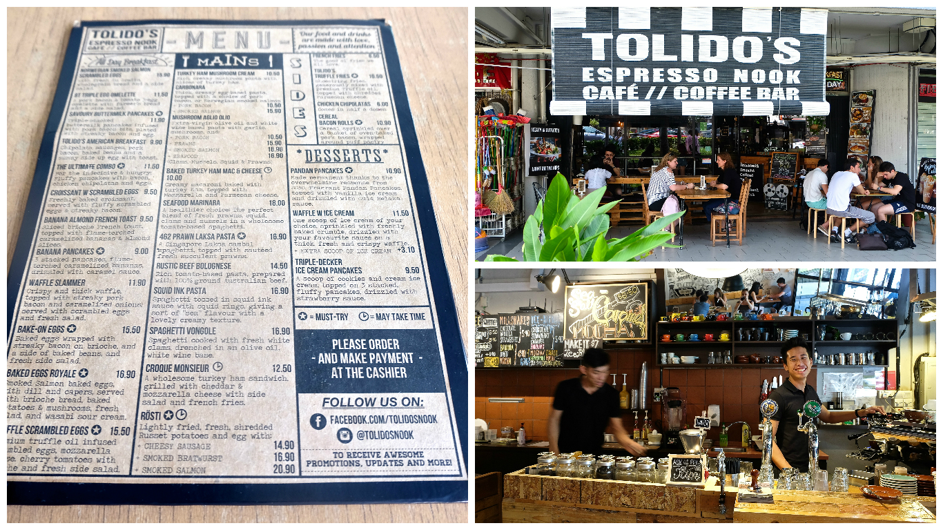 Venture beyond the CBD and you will find some real gems for breakfast in Singapore. I found two such places located on the outer edge of the Arab district. The first being Tolido’s Espresso Nook and the second simply called Artistry. What brought me to these cafes, was the fact that my hotel’s breakfast was less than impressive – actually it was downright woeful! So I was looking for the exceptional, a place where I could relax with a good coffee, awaiting a freshly cooked breakfast that would have my tastebuds rejoicing.