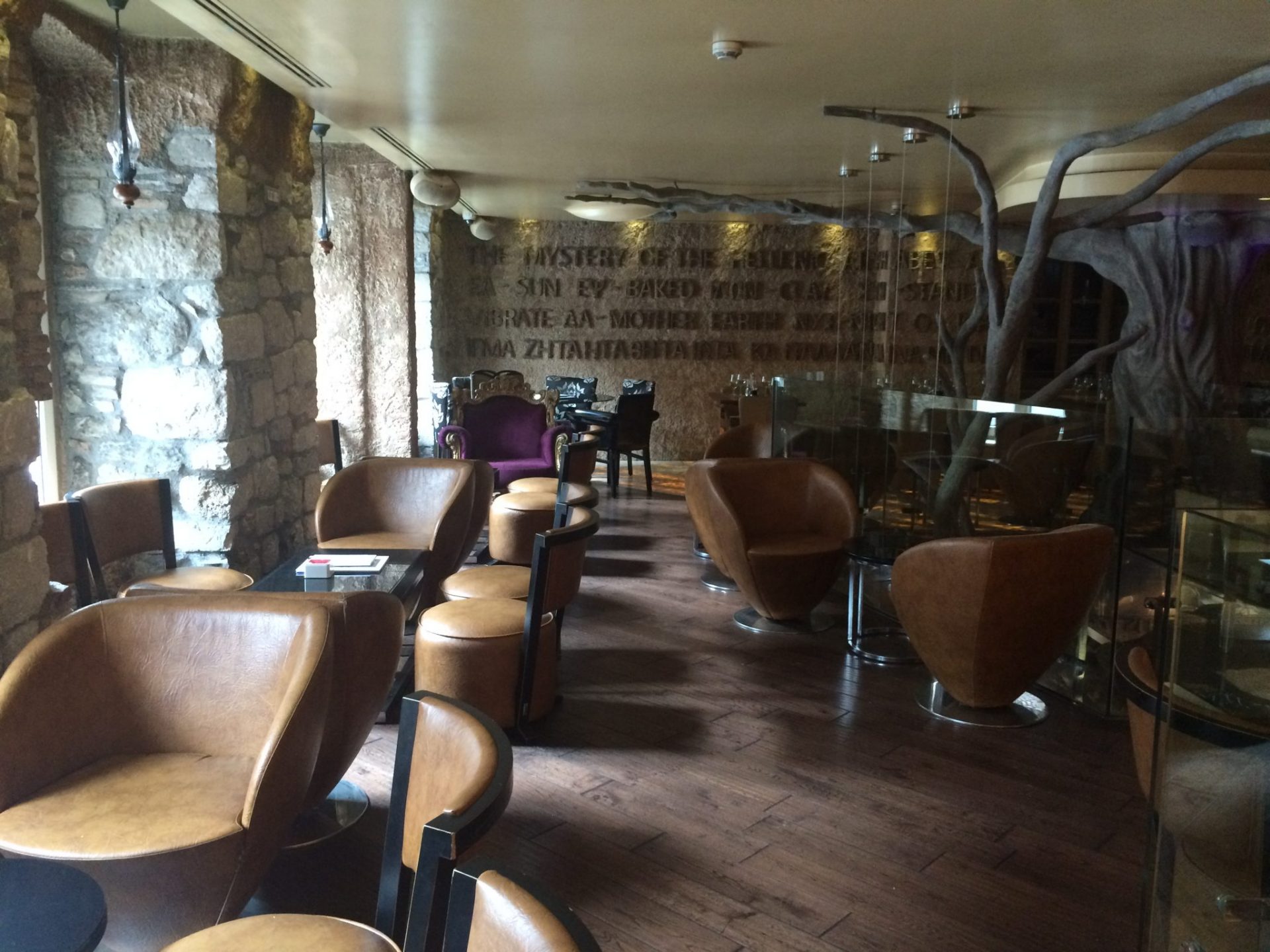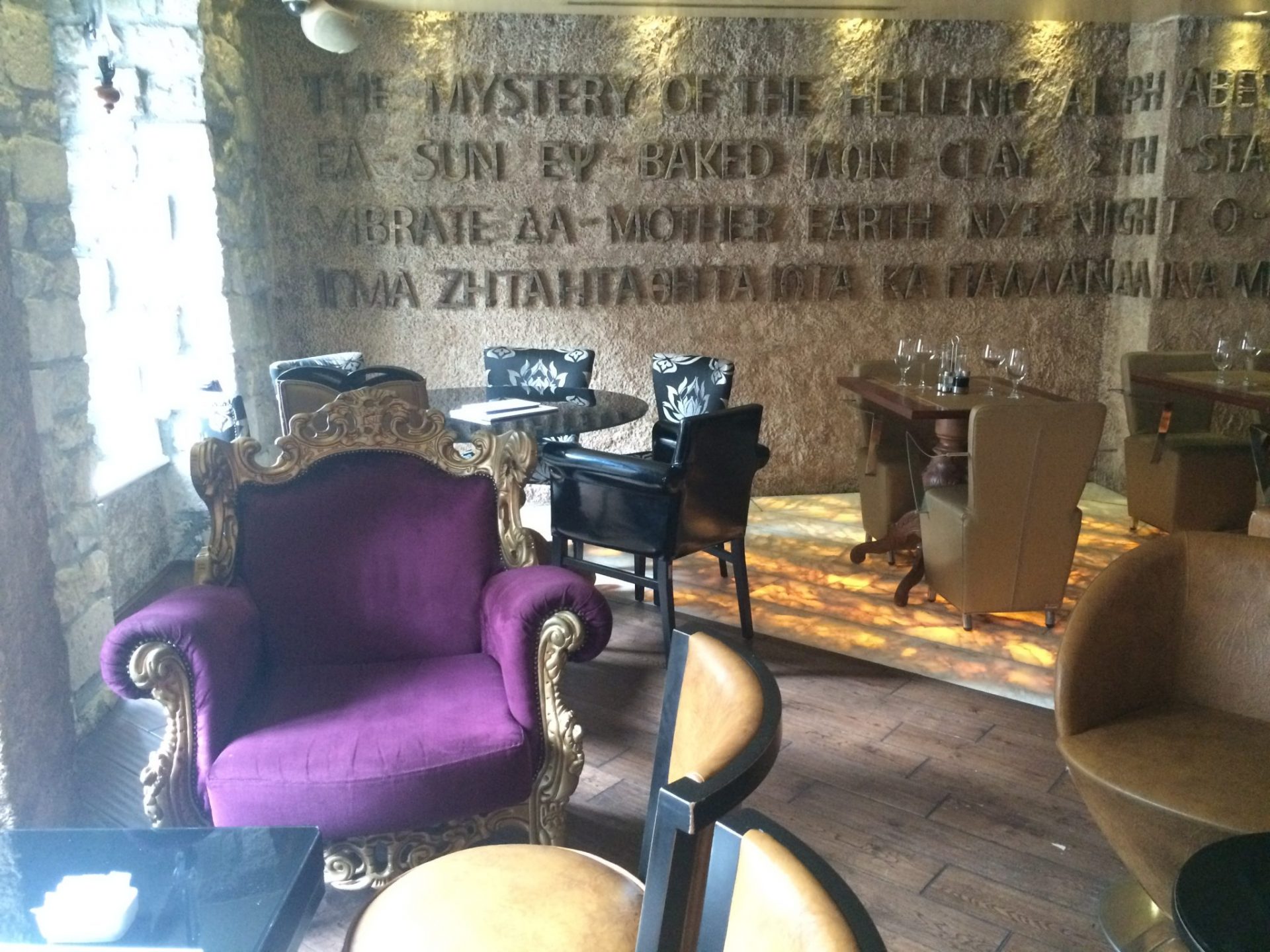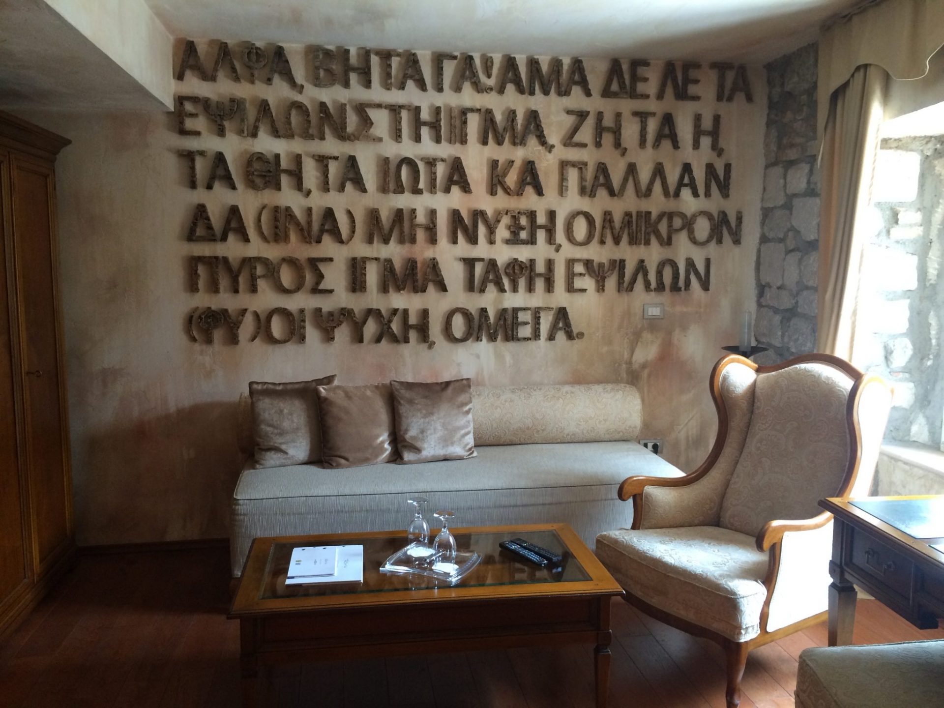 There are only nine rooms at this hotel and kudos to the design team. By having a smaller amount of rooms, it allows for each room to enjoy spacious surrounds. I stayed in a superior room (the Delta room) and indeed it was incredibly spacious. The room had three distinct areas, the living room, bedroom and bathroom. The room was well appointed with a luxury look and feel to it. Each room is based on a letter from the Greek alphabet, with ancient lettering adorning the walls. The room was well equiped with all that you would expect from a boutique hotel, such as mini bar, robes, slippers, free wifi and toiletries.