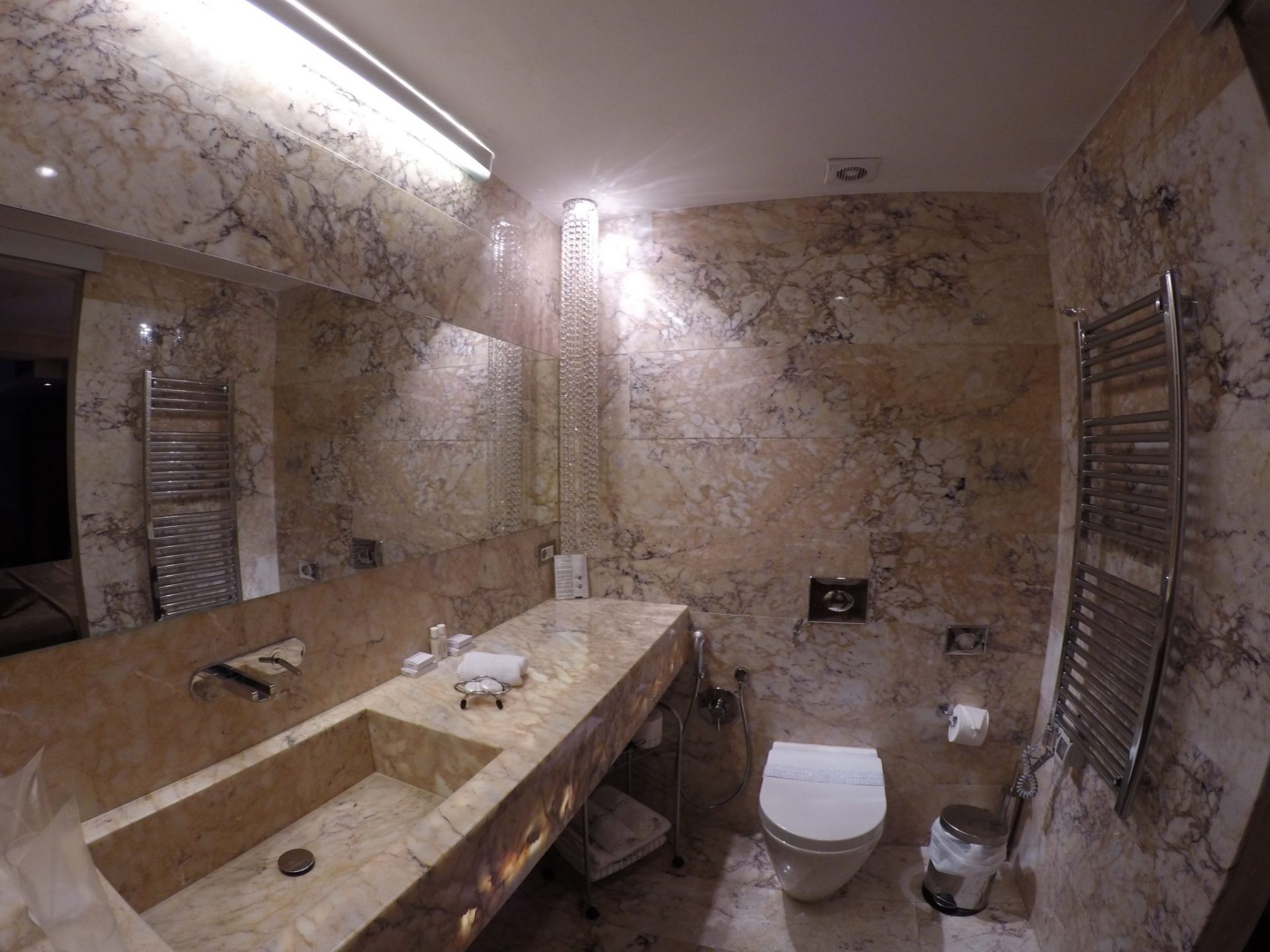The bathroom has a stunning fit out with marble, chandelier lights and a multifunction shower.