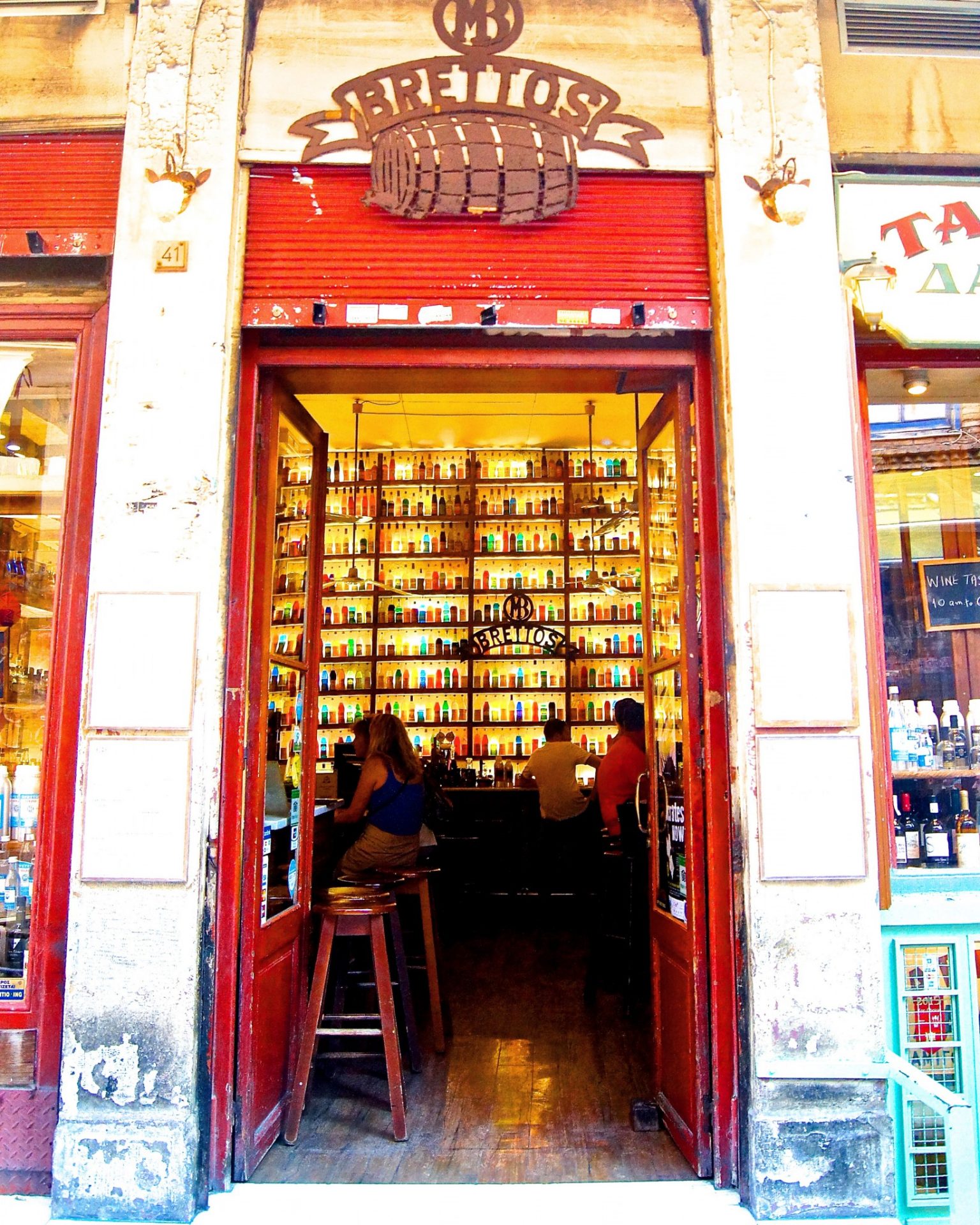 In my wanderings around Athens, I came across a cool little bar called Brettos. Most people visiting Athens will end up in the Plaka area, for it’s where you will find many archeological sites, great street dining, shopping and of course Brettos. As I was exploring the streets, I came across Brettos bar in Athens by pure chance, I’m so glad I did. From the street my eyes were immediately drawn inside by the colourful wall of brightly lit bottles. The sign out the front said wine tasting all day, so I checked my watch (it was early) and figured ‘ah it must be 5 o’clock somewhere in the world’, so in I went to take a closer look.