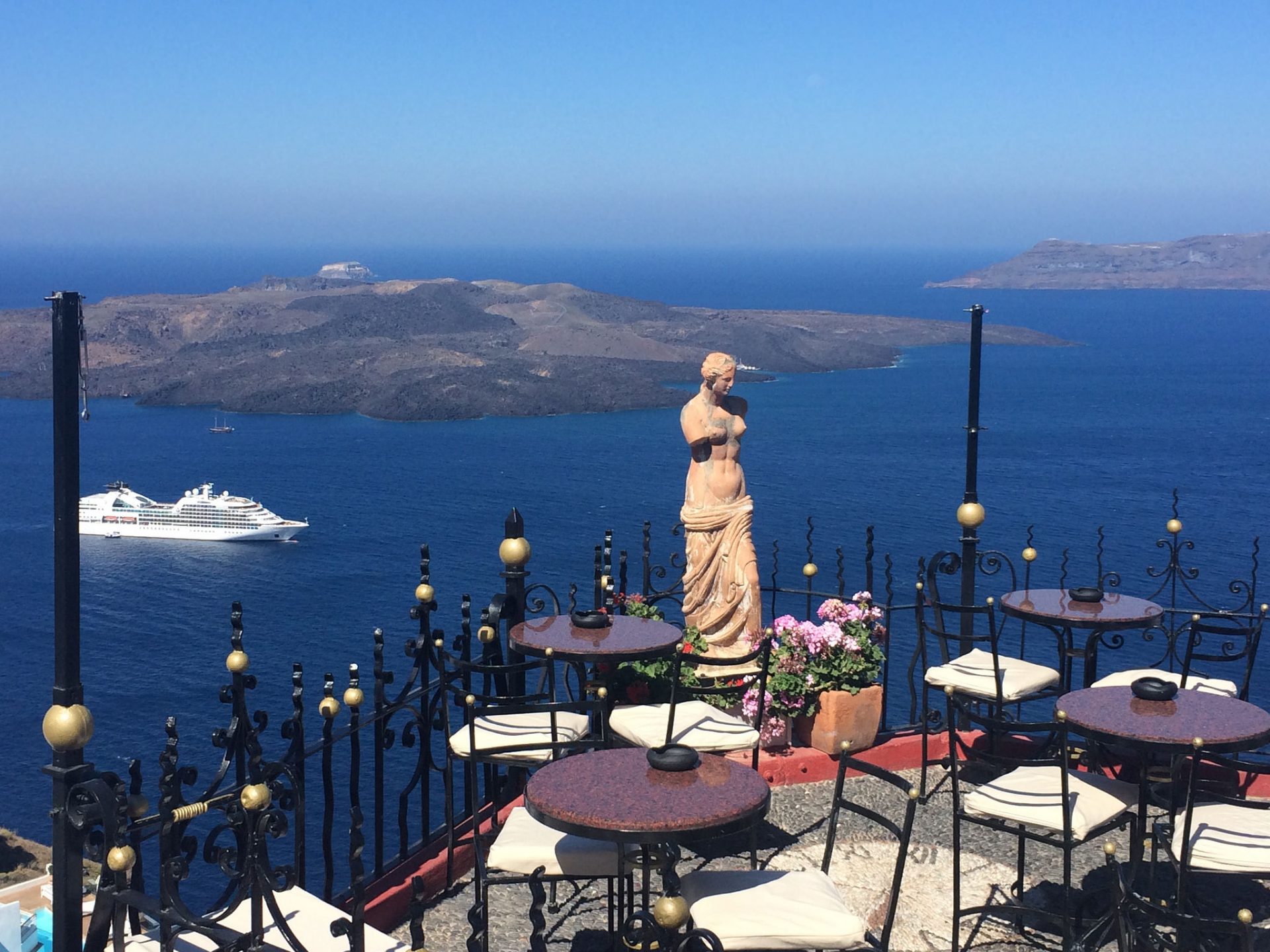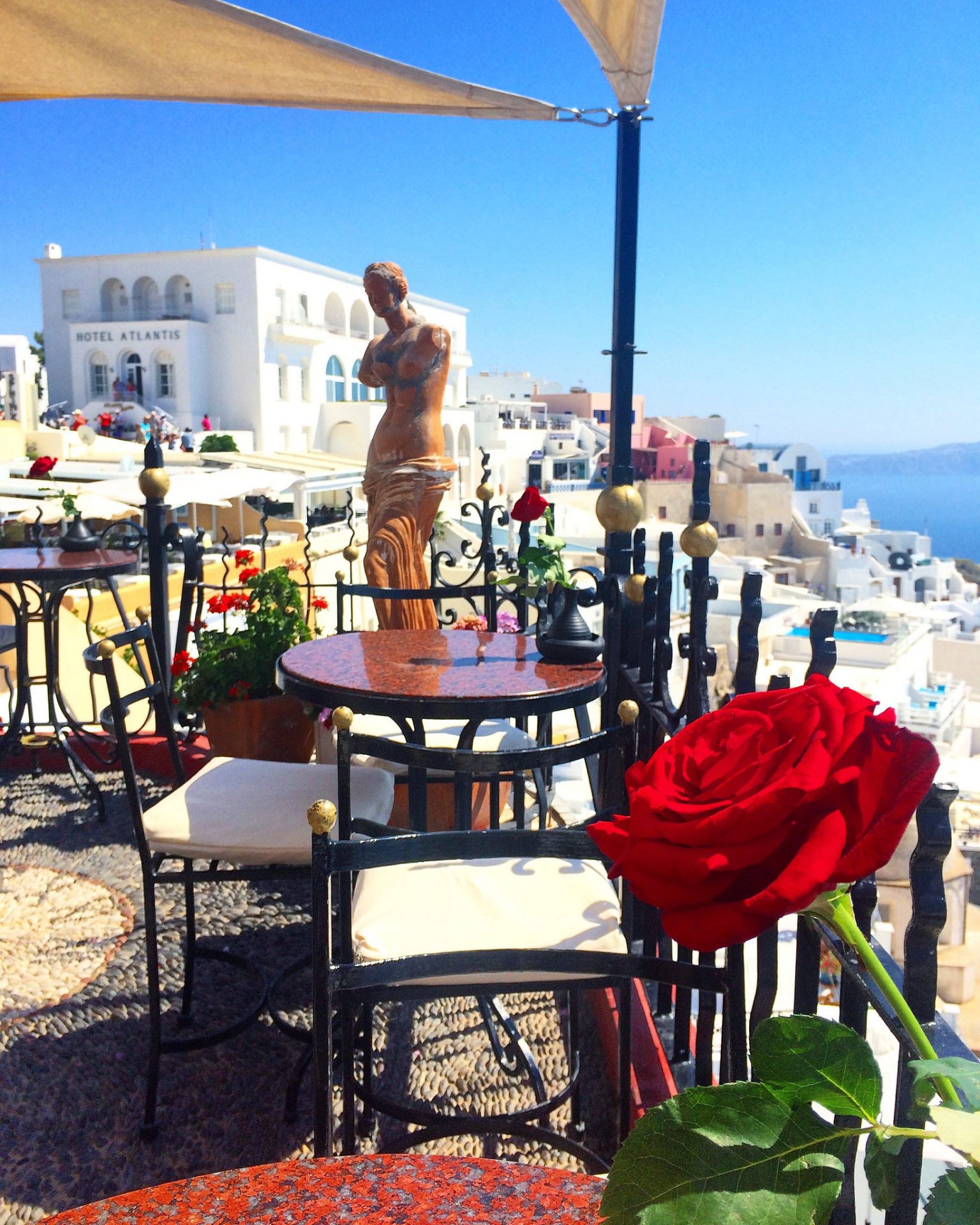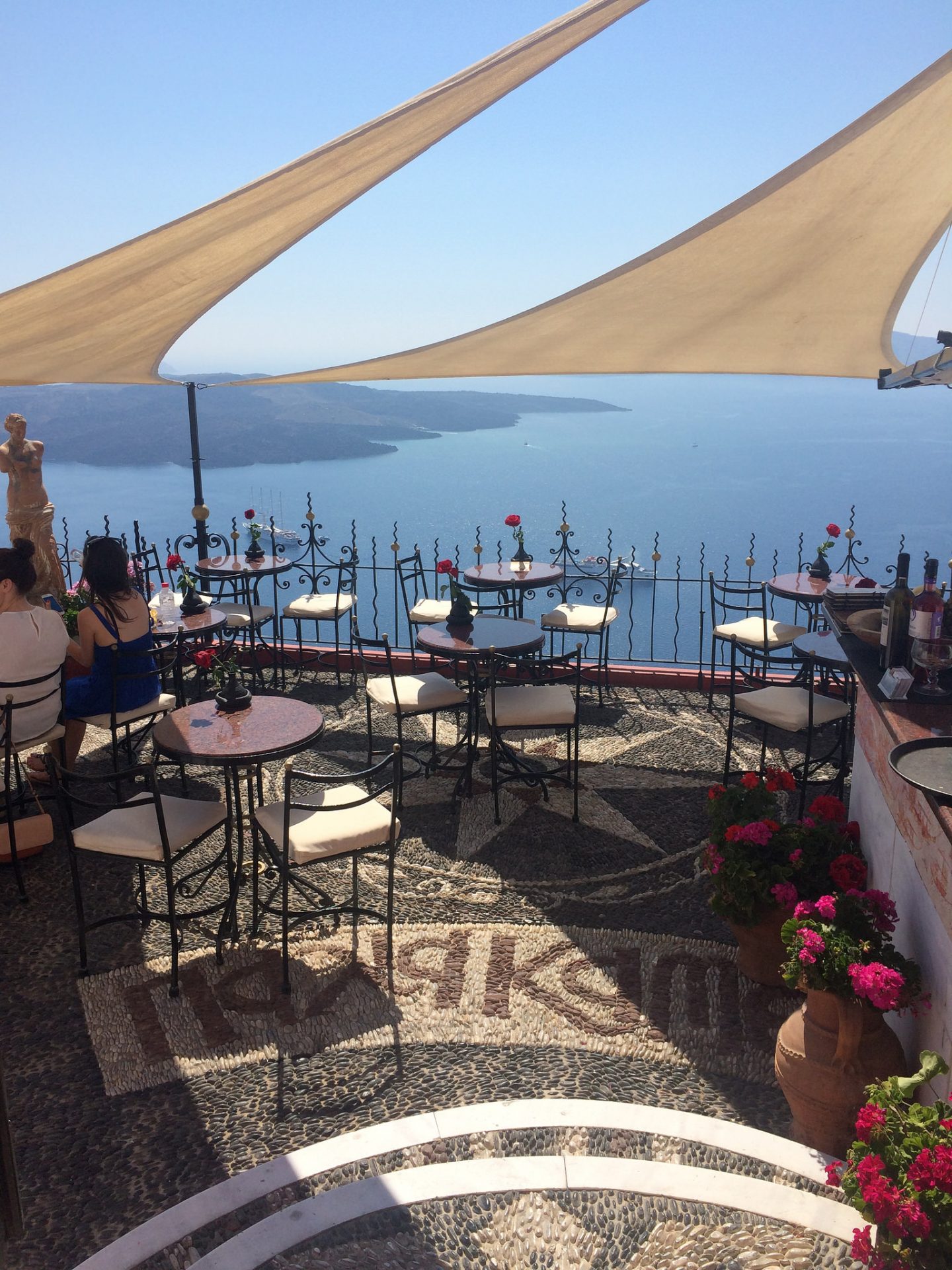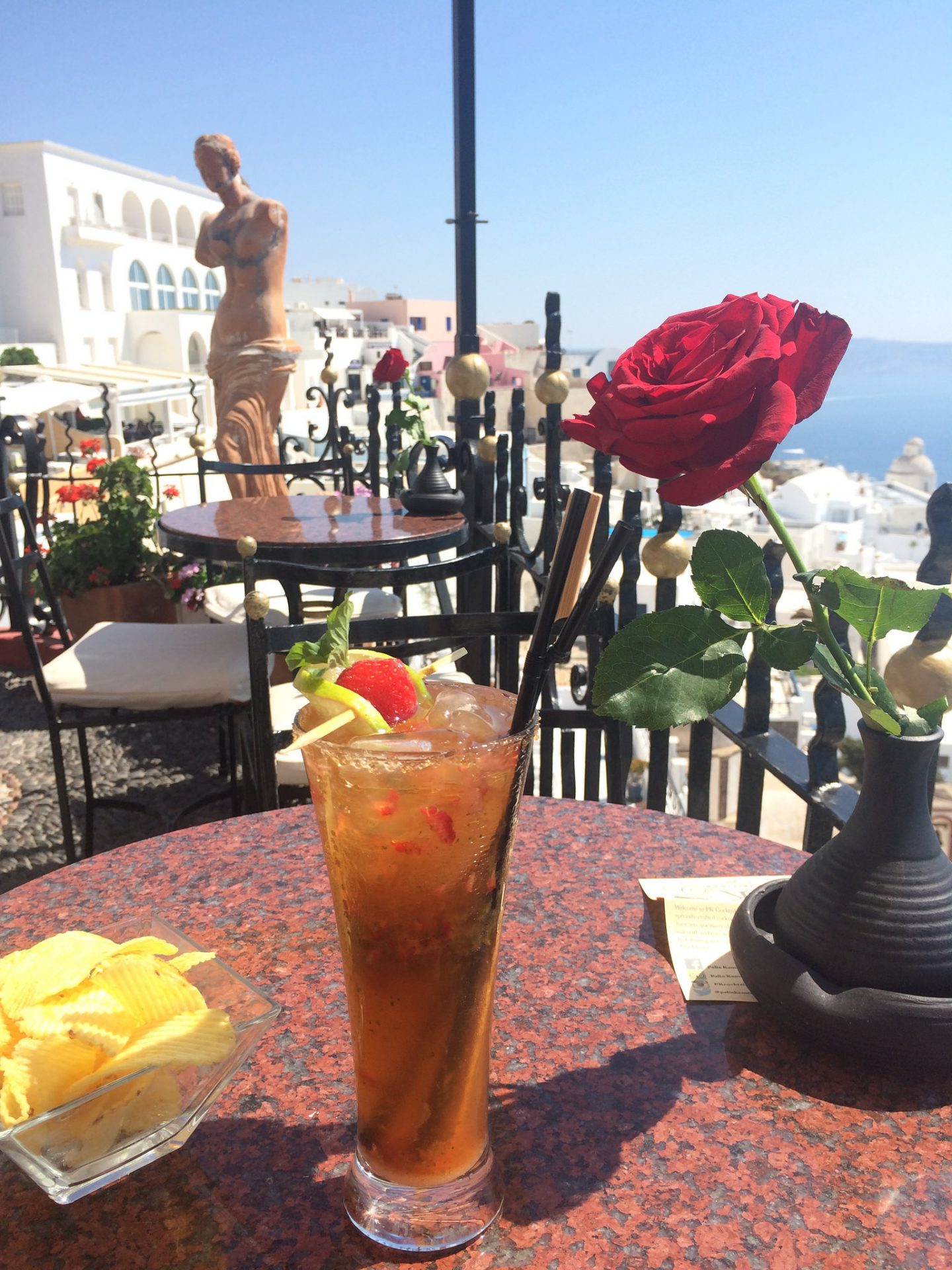 The PK Cocktail bar is set up like a balcony garden, with potted plants, a statue of Aphrodite and wrought iron tables that match the balustrade. Roses adorn each table during the day and once the evening descends upon Santorini, the roses are replaced with candles. If it gets a little chilly at night, then guests are offered blankets to keep warm.