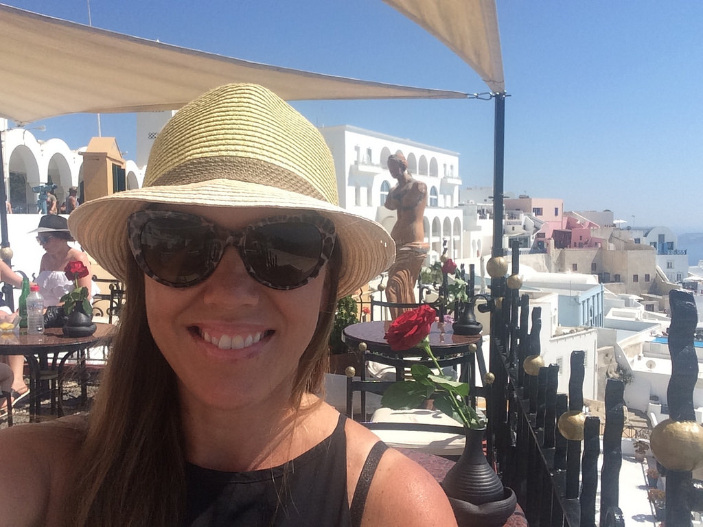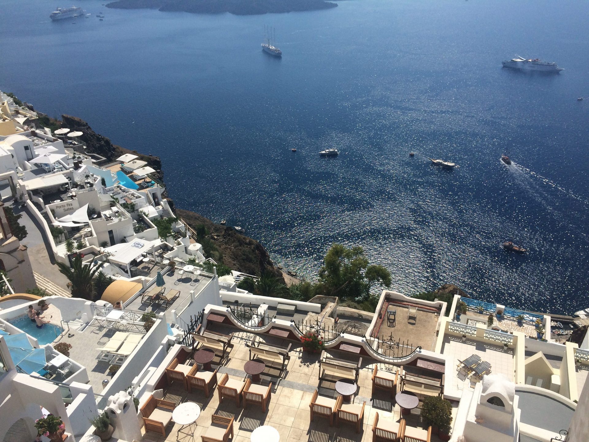 From the street, the concrete doorway frames the magnificent view and simply beckons you to step inside. Once inside, you will find a great choice of classy cocktails, made with quality spirits and beautiful fresh fruit. They boast that all their ingredients are freshly made and that they never use artificial syrups or flavourings. It is a little on the expensive side (as with most places in Santorini) but honestly, where in the world will you get an incredible view like this to sip your cocktail too?