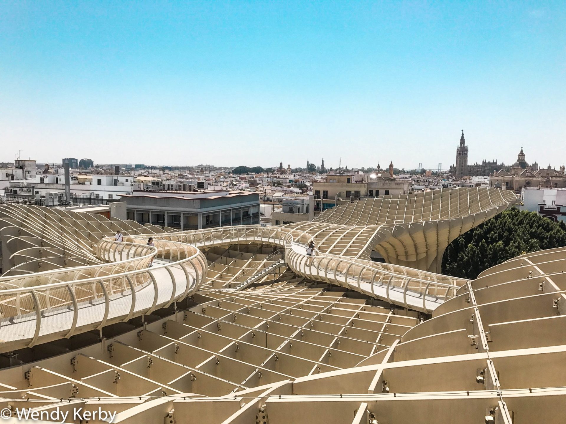 After Breakfast I headed on foot to the Metropol parasol. A wooden art structure that resembles giant mushrooms. Plaza one (first level) is free to wander about, the second level (rooftop) you will need to pay. The entrance fee is 3 Euro. Once at the top, there is a panoramic view over Seville’s roof tops and a little bar/cafe to have a drink. Entrance is down a ramp going under ground level, where the ticket booth and information is located.