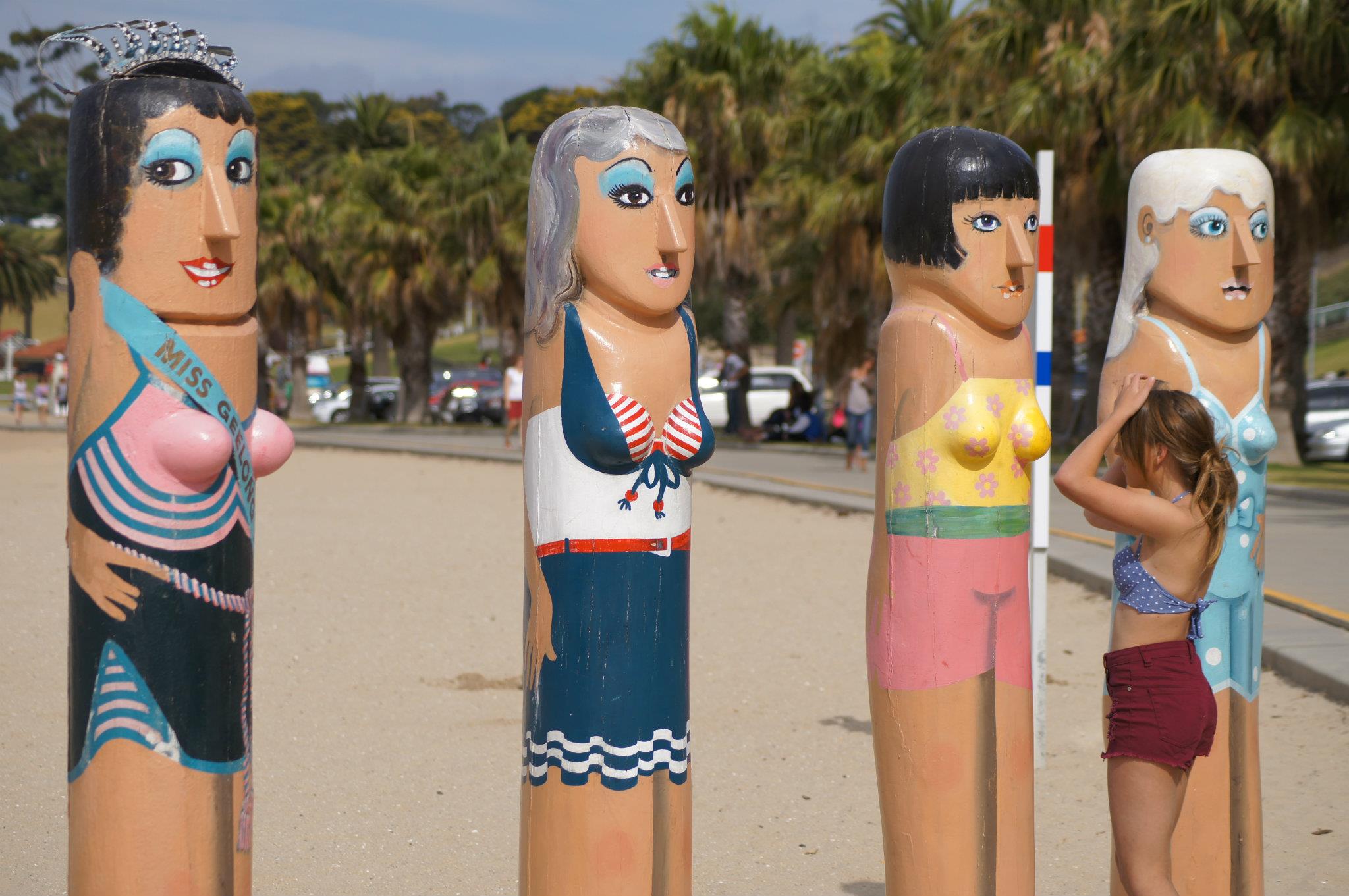 The bollards are the work of artist Jan Mitchell. Jan was commissioned by the City of Greater Geelong to transform old timbers and piles from a city pier, that was damaged by fire in the 1980s, into remarkable works of art that stop young and old in their tracks.