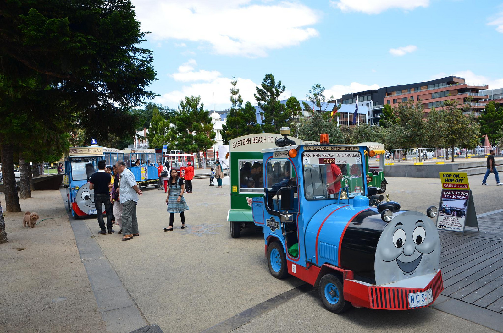 Starting at the Carousel, the miniature train will take you on a leisurely ride along the waterfront to the Eastern Beach Pools and back again. The train is about a 20 minute ride, leaving from the carousel every 30 minutes. The train operates every weekend, school and public holidays.