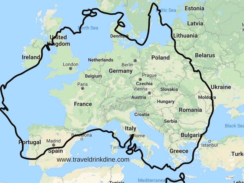 Australia also has the longest national highway in the world at 14,500 kilometres. To give you a little idea on how big Australia is, then take a look at the map of Europe below, Europe fits easily inside Australia. In fact Australia is twice the size of Europe.